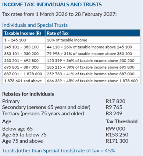 Trusts: Special trusts are by and large taxed as individuals, but other trusts are taxed at a flat rate of 45% – also unchanged from last year.
