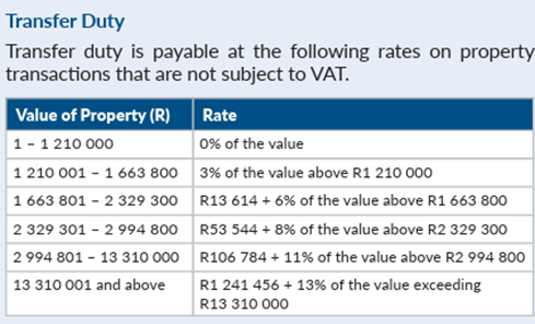 Unchanged from last year, you pay no transfer duty if the property you are buying sells for at (or below) the set threshold of R1,210,000.
