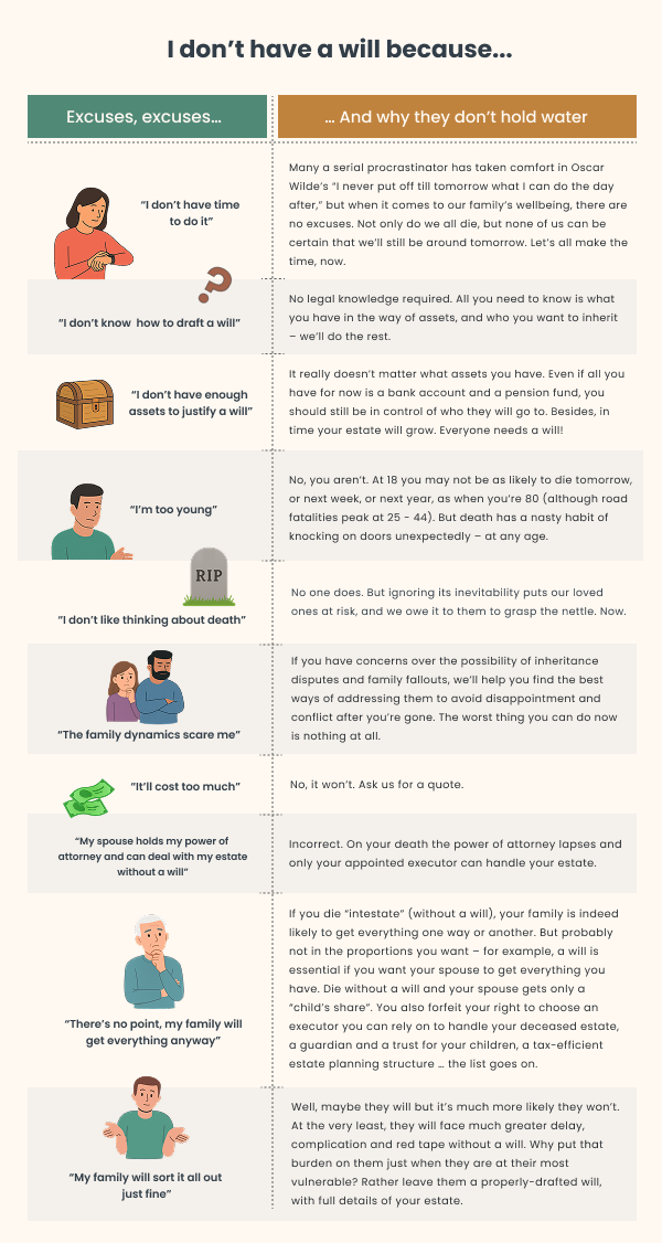 | “I don’t have enough assets to justify a will” | It really doesn’t matter what assets you have. Even if all you have for now is a bank account and a pension fund, you should still be in control of who they will go to. Besides, in time your estate will grow. Everyone needs a will! |