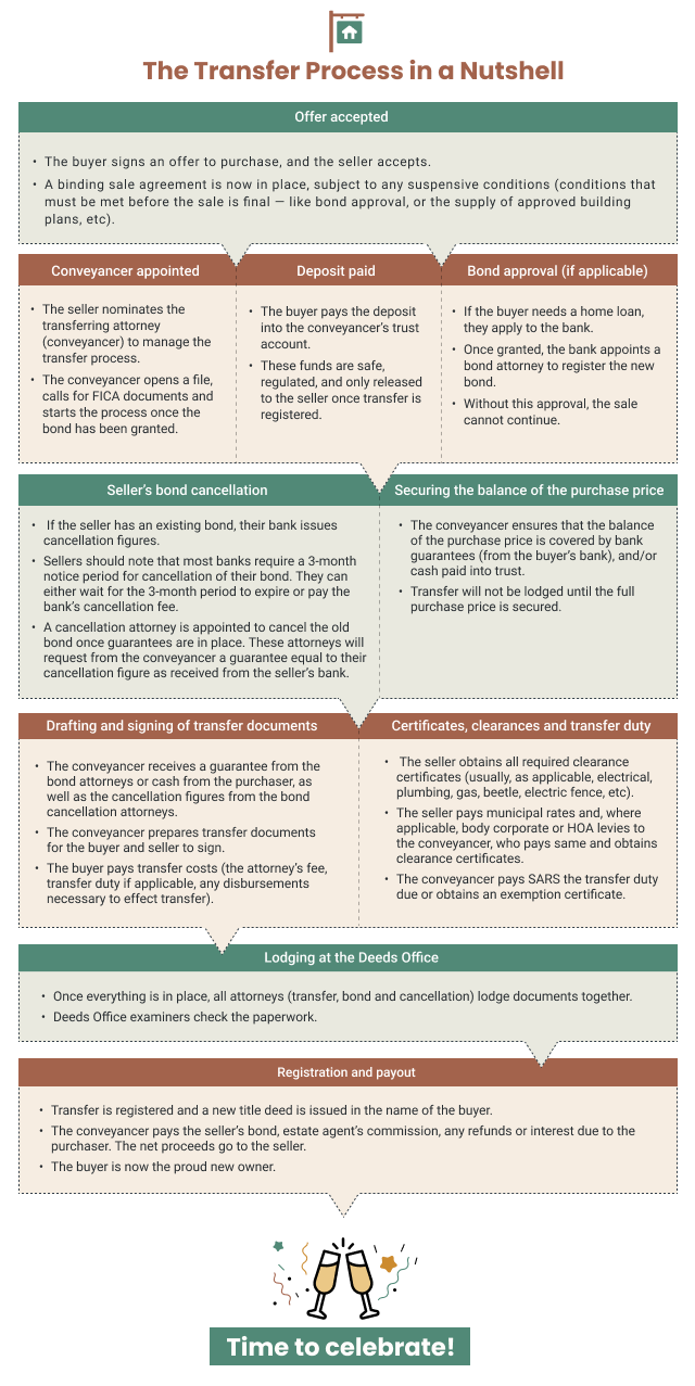 - The conveyancer opens a file, calls for FICA documents and starts the process once the bond has been granted.